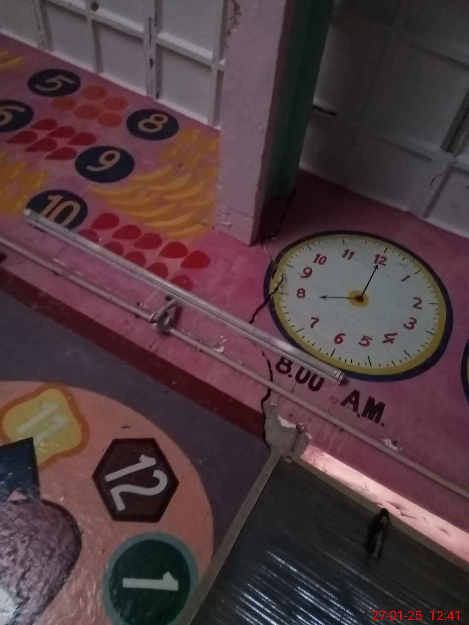 | Total no. of Classrooms: 2 No. of Classrooms Used for Teaching: 2 No. of Classrooms Storing Old Furniture, FTBs, etc: 0Comments if Any: Whole building has long visible cracks potentially in dangerous condition Both classrooms along with varanda are in use |