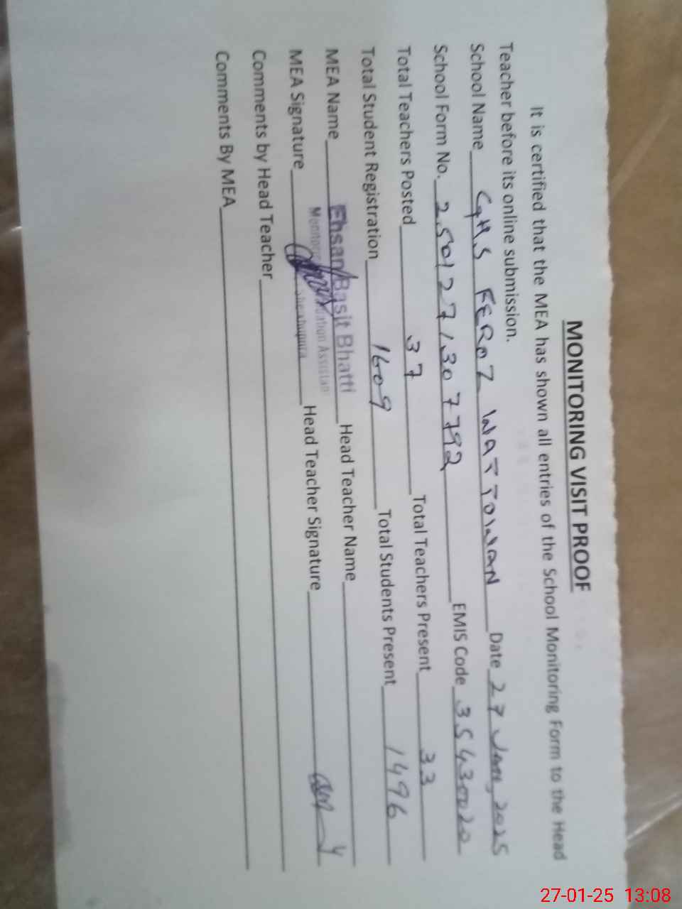| EMIS Code: 35430020 | Name of School: GHS FEROZ WATTOWAN | |||