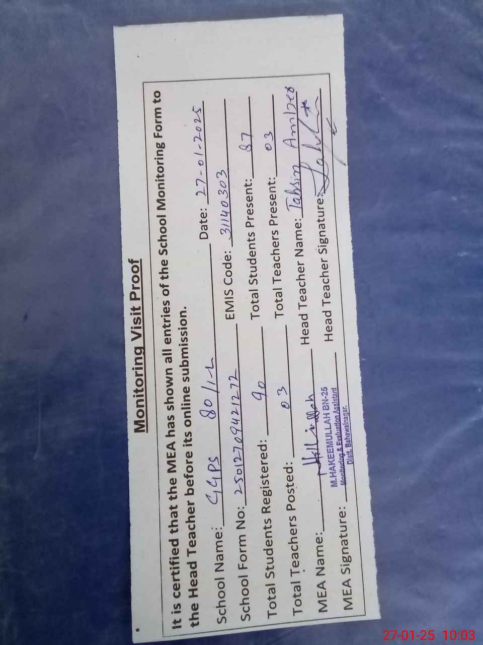 | Attendance Register | Head Teacher | MEA with School | Visit Proof |