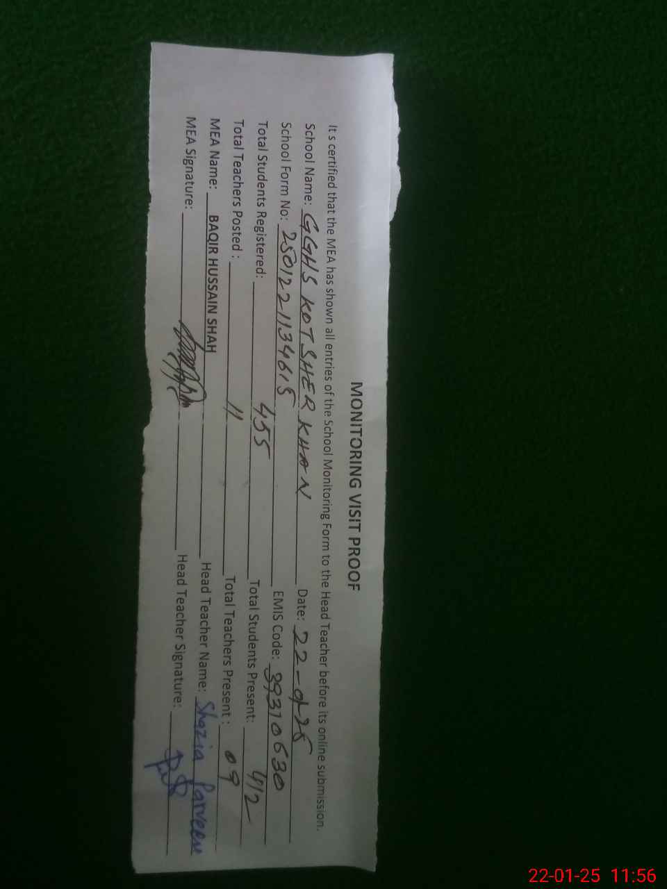 | Attendance Register | Head Teacher | MEA with School | Visit Proof |