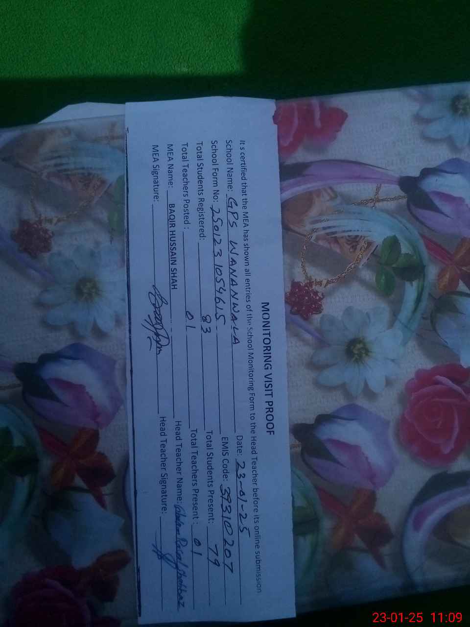 | Attendance Register | Head Teacher | MEA with School | Visit Proof |