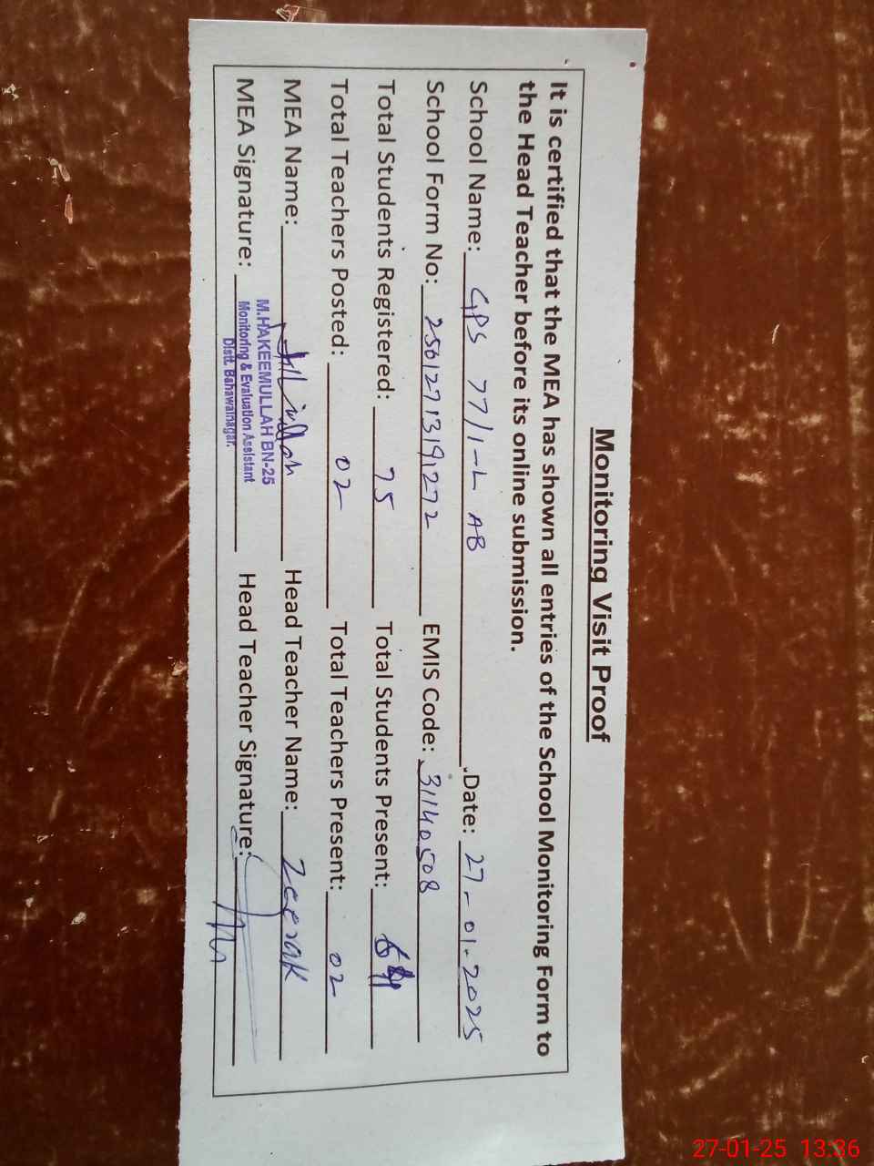 | Attendance Register | Head Teacher | MEA with School | Visit Proof |