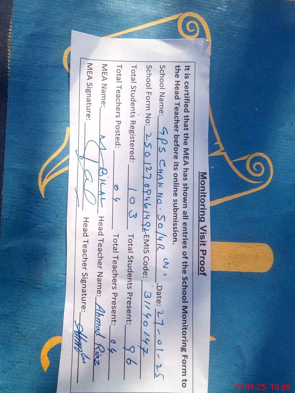 | Attendance Register | Head Teacher | MEA with School | Visit Proof |