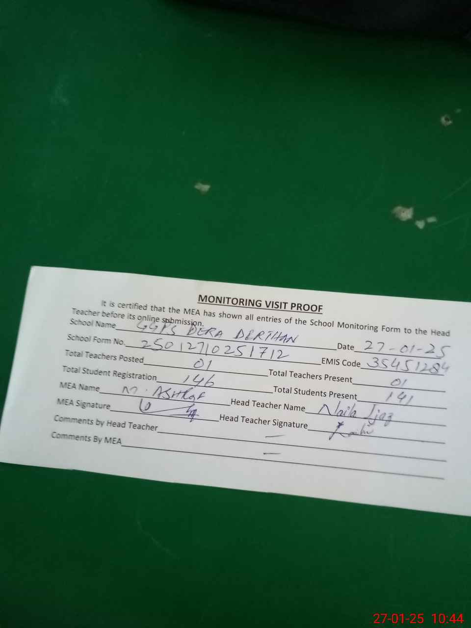 | Attendance Register | Head Teacher | MEA with School | Visit Proof |