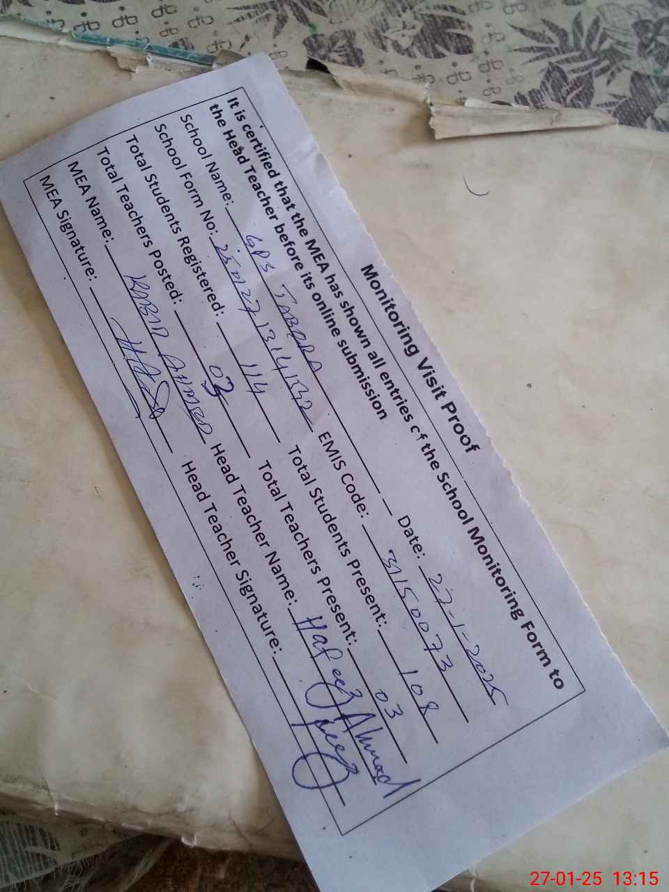 | Attendance Register | Head Teacher | MEA with School | Visit Proof |