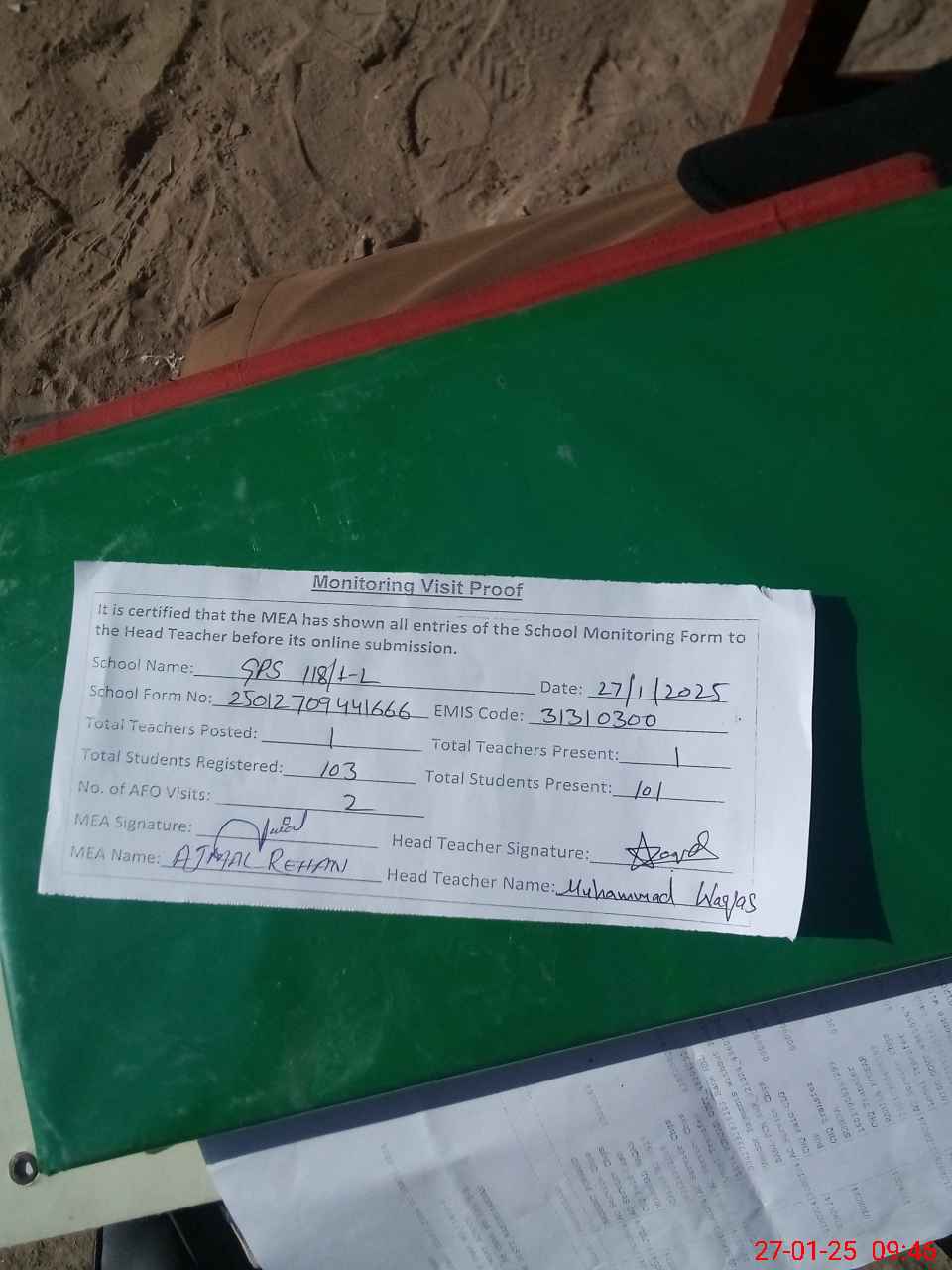 | Attendance Register | Head Teacher | MEA with School | Visit Proof |