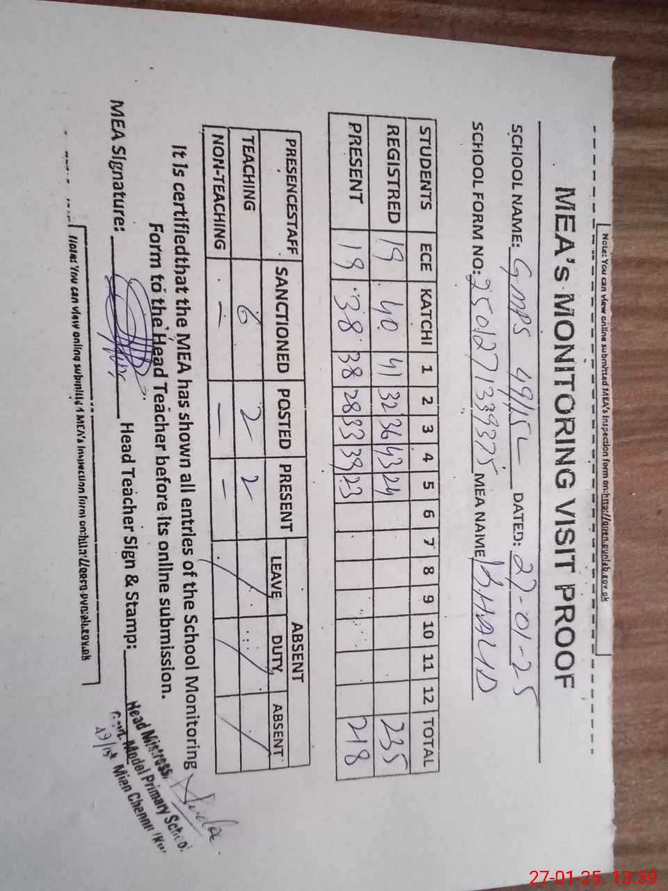 | Attendance Register | Head Teacher | MEA with School | Visit Proof |