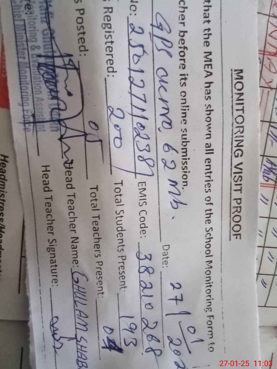 | Name: GH**** SH**** Designation: (School Headmaster's/Headmistress's) PST Phone/Cell Number: 03**** |