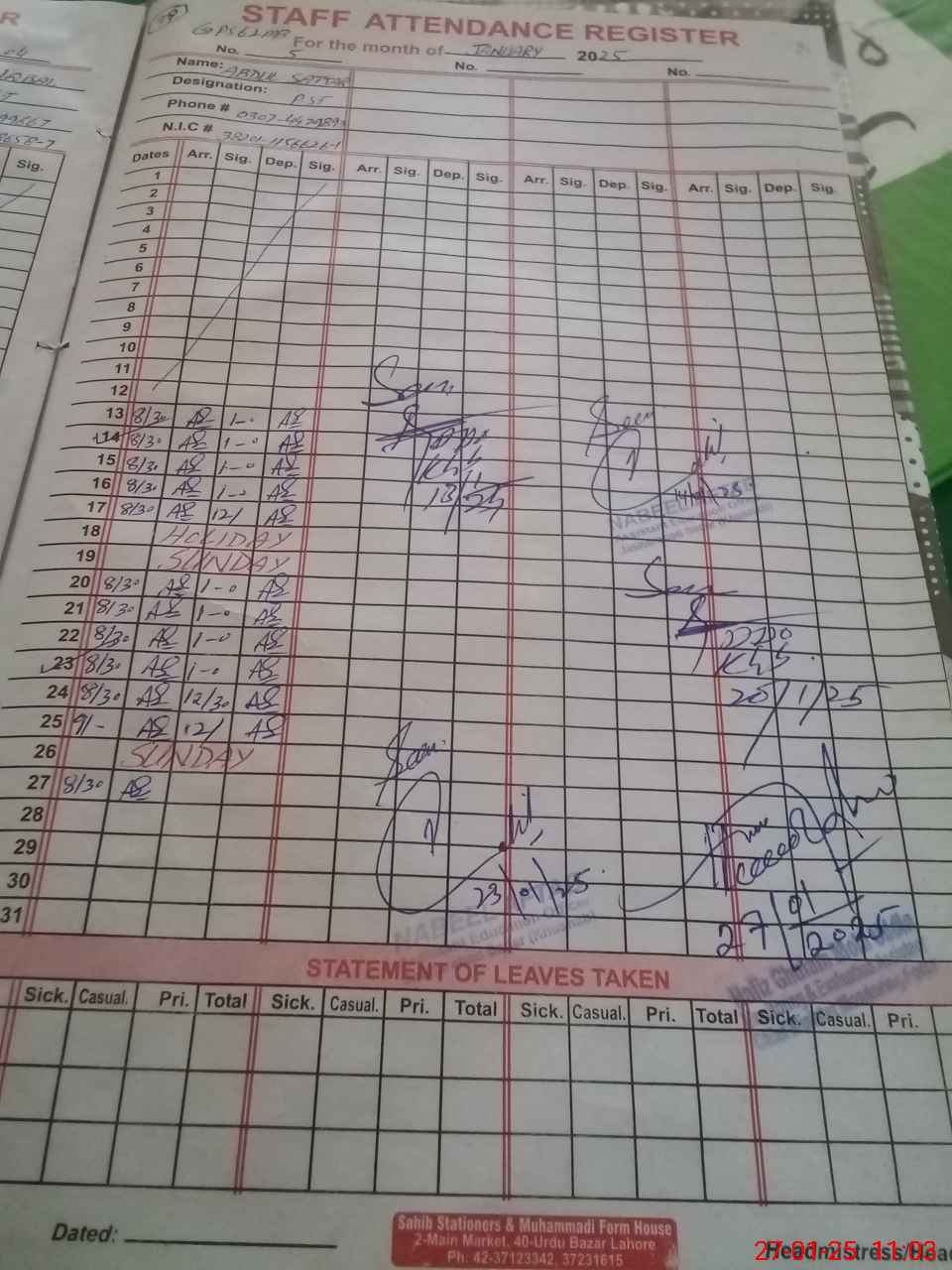 | CNIC | Full Name | Designation | R/C | Absence During Last Calender Month |