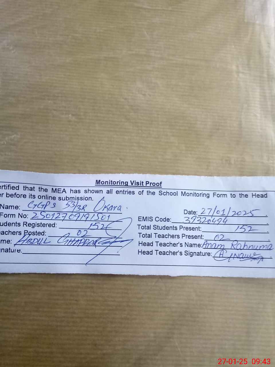 | District: OKARA | Tehsil: OKARA | Markaz: GASHKORI - FEMALE | Level: Primary | |