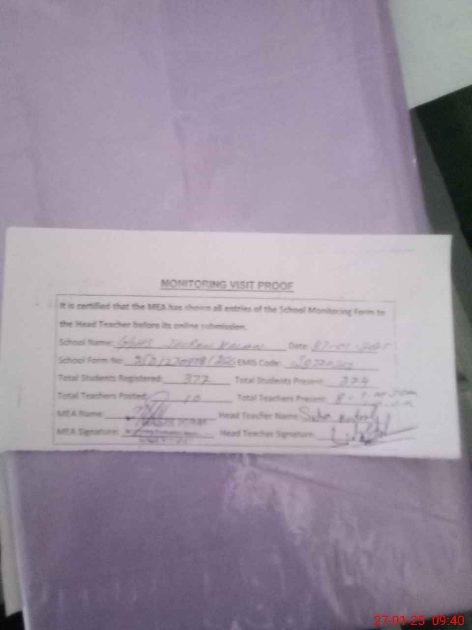 | Attendance Register | Head Teacher | MEA with School | Visit Proof |