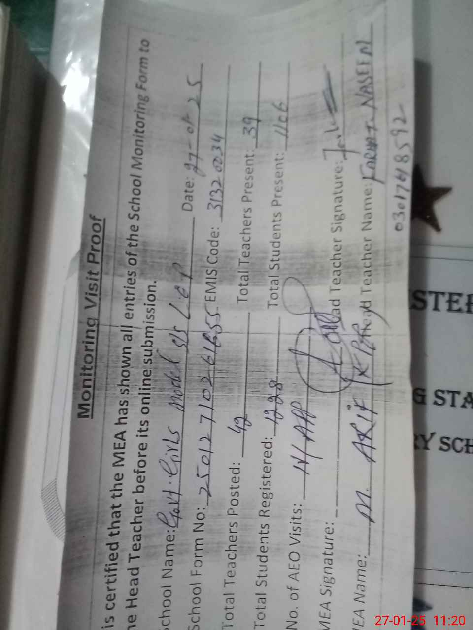 | Attendance Register | Head Teacher | MEA with School | Visit Proof |