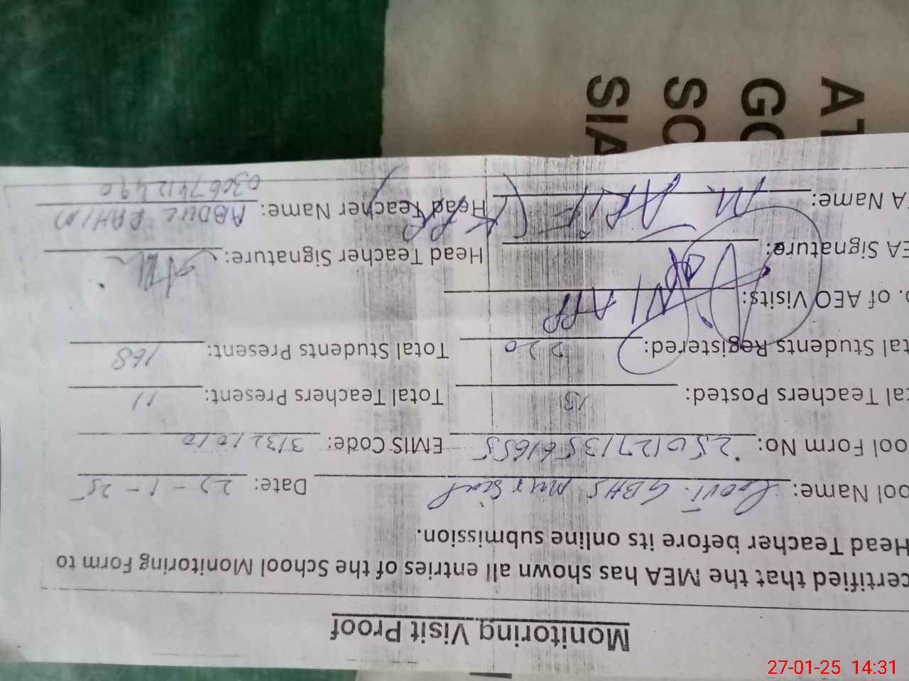 | Attendance Register | Head Teacher | MEA with School | Visit Proof |