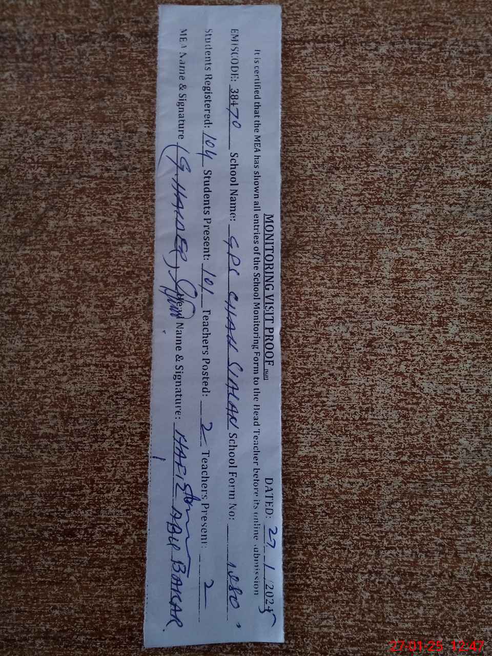 | Attendance Register | Head Teacher | MEA with School | Visit Proof |