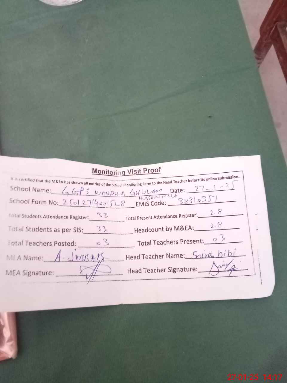 | Attendance Register | Head Teacher | MEA with School | Visit Proof |
