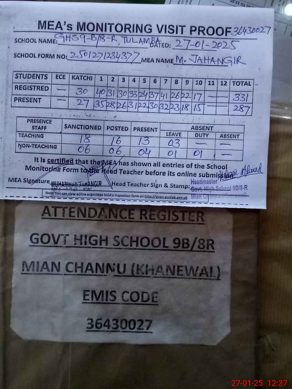 | EMIS Code: 36430027 | Name of School: GHS 9-B/8-R, TULAMBA | |||