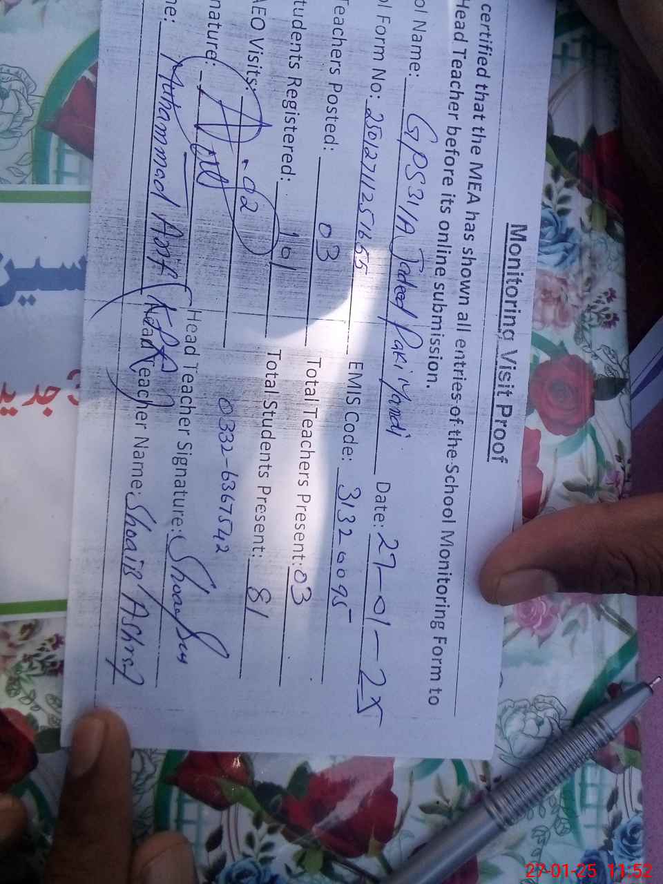 | Name: MU**** MA**** Designation: (School Headmaster's/Headmistress's) PST Phone/Cell Number: 03**** |