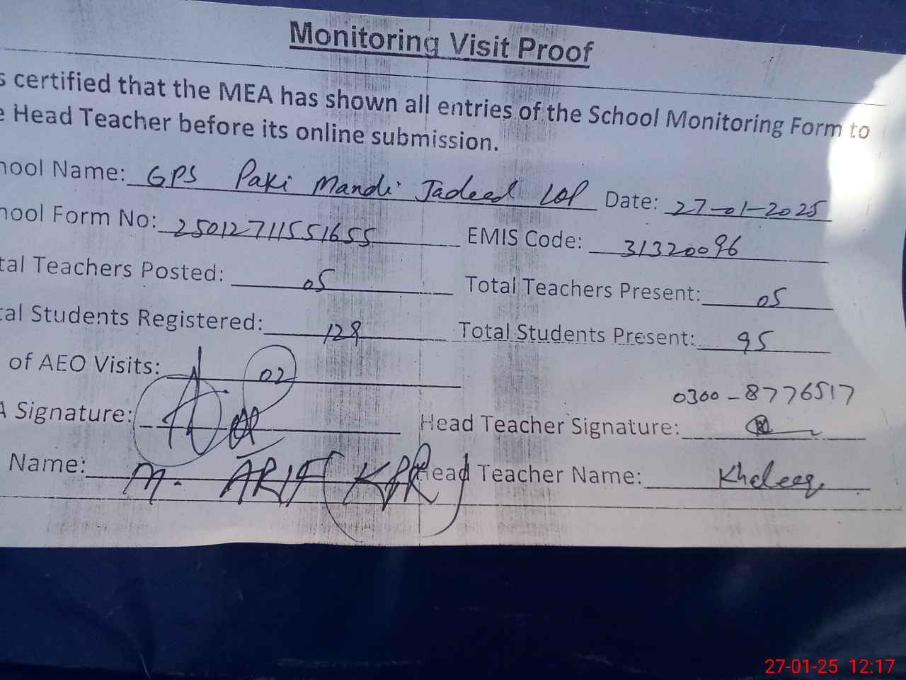 | Name: Mu**** Kh**** Ah**** Designation: (School Headmaster's/Headmistress's) PST/PTC/JV Phone/Cell Number: 03**** |
