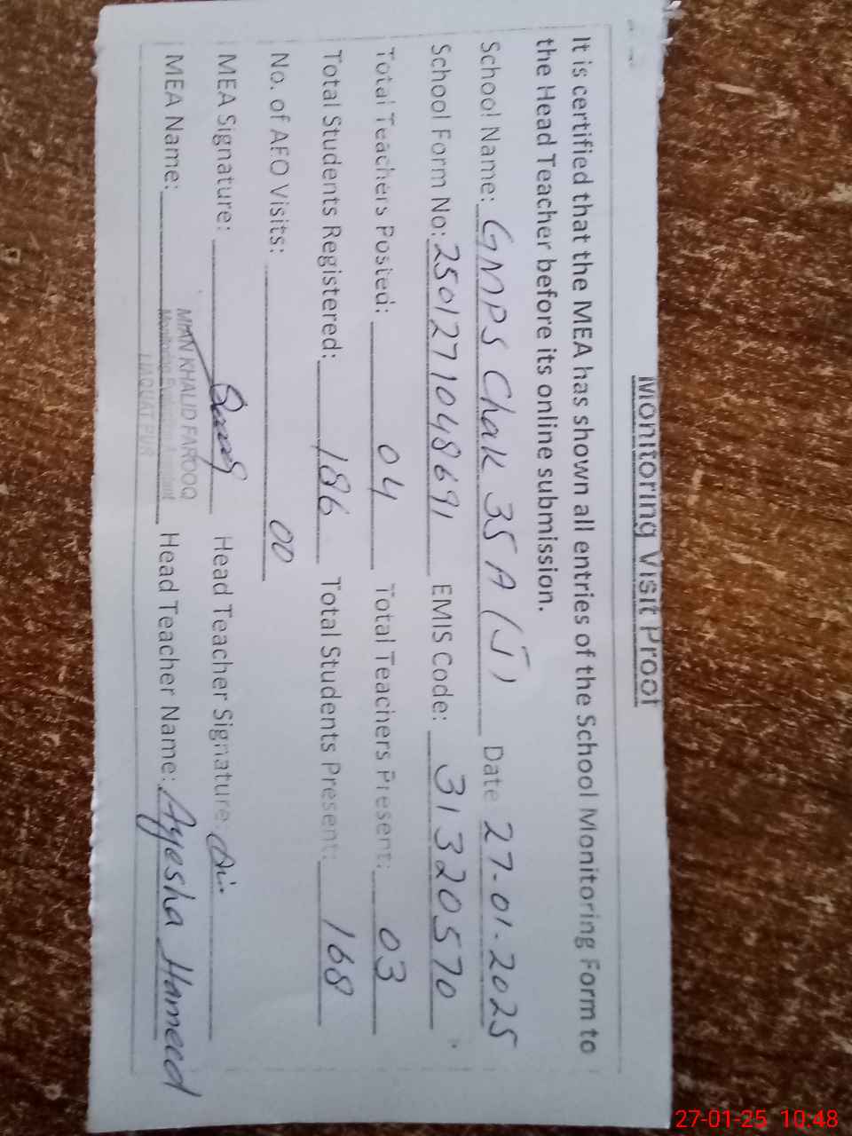 | EMIS Code: 31320570 | Name of School: GMPS CHAK 35/A NEW | |||