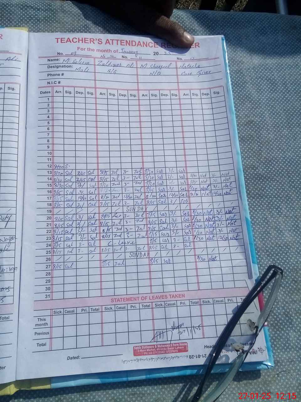 | CNIC | Full Name | Designation | R/C | Absence During Last Calender Month |