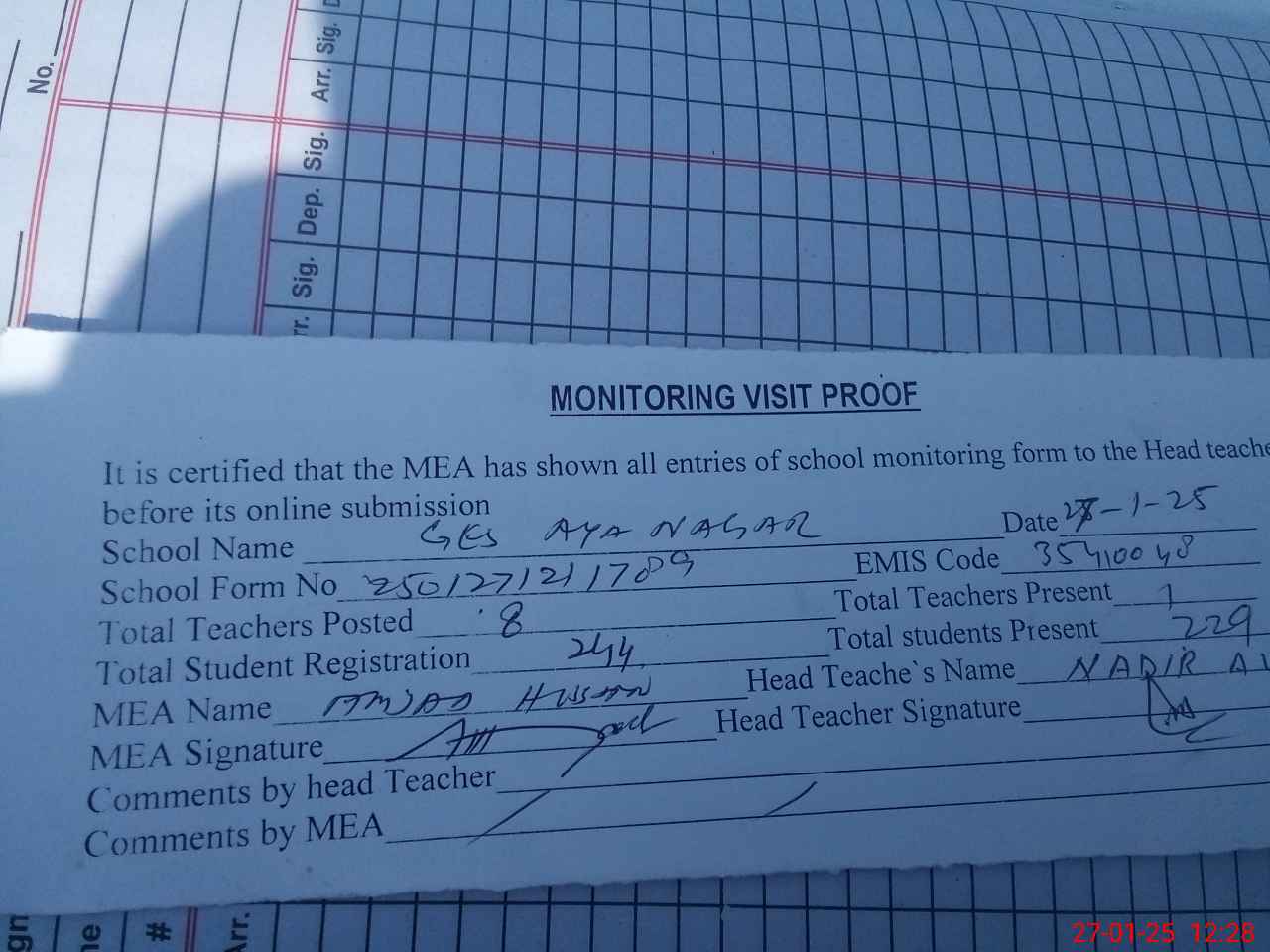 | Attendance Register | Head Teacher | MEA with School | Visit Proof |