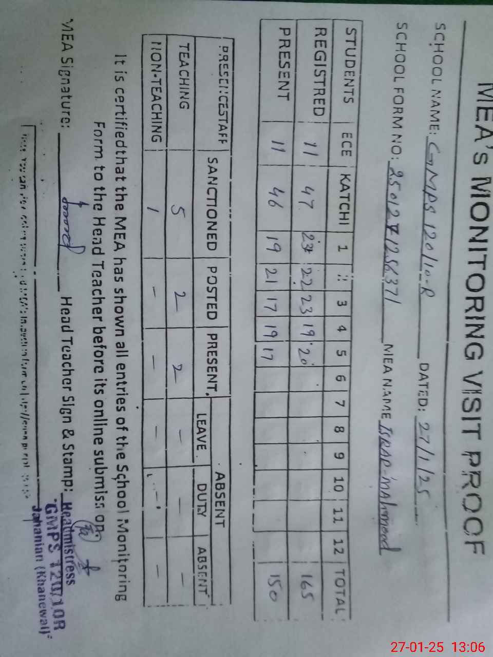 | Attendance Register | Head Teacher | MEA with School | Visit Proof |