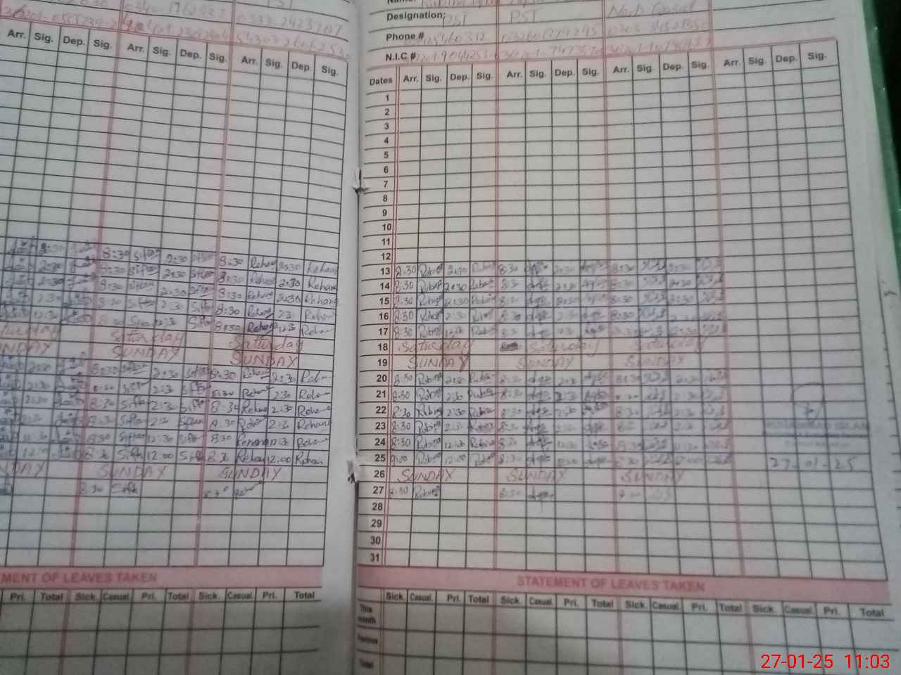 | CNIC | Full Name | Designation | R/C | Absence During Last Calender Month |