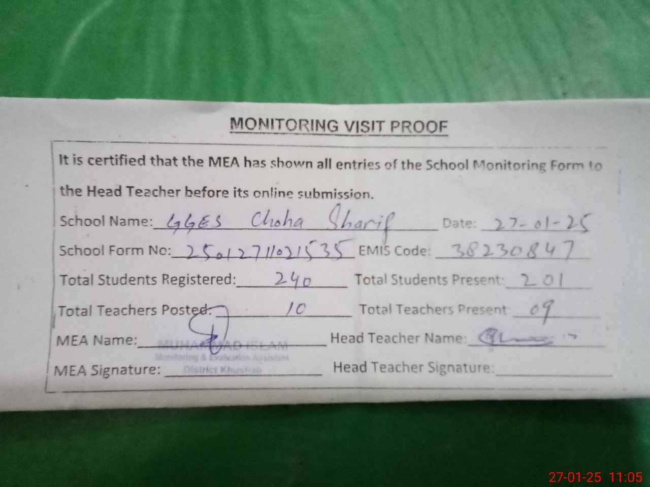 | Attendance Register | Head Teacher | MEA with School | Visit Proof |