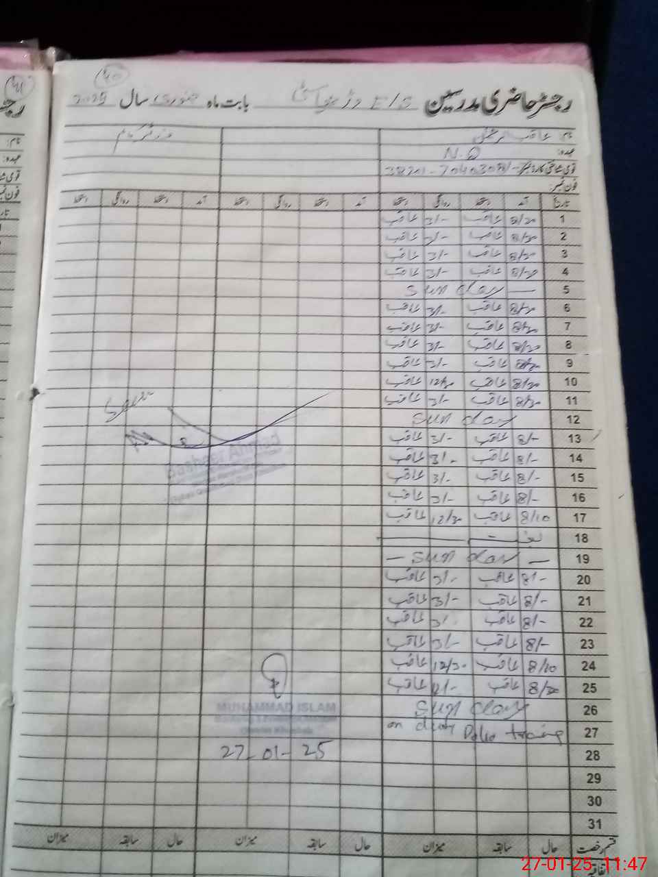 | CNIC | Full Name | Designation | R/C | Absence During Last Calender Month |