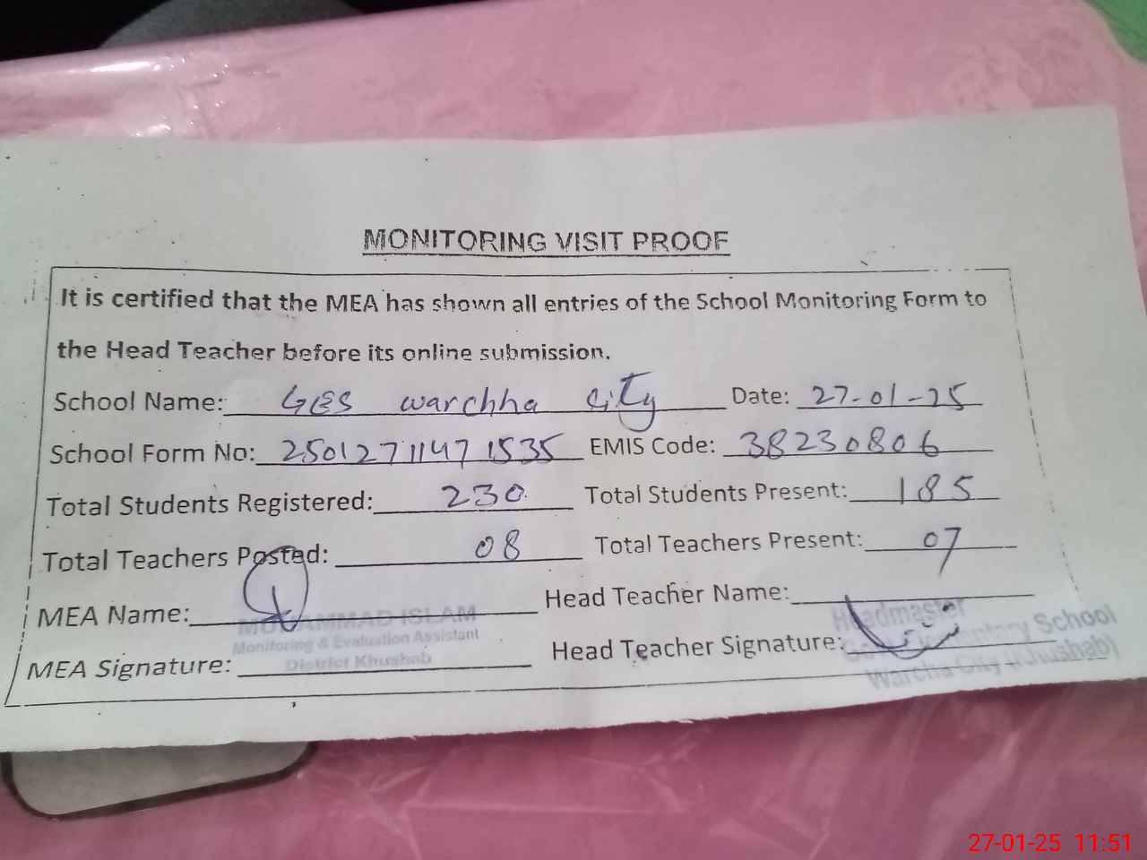 | Attendance Register | Head Teacher | MEA with School | Visit Proof |