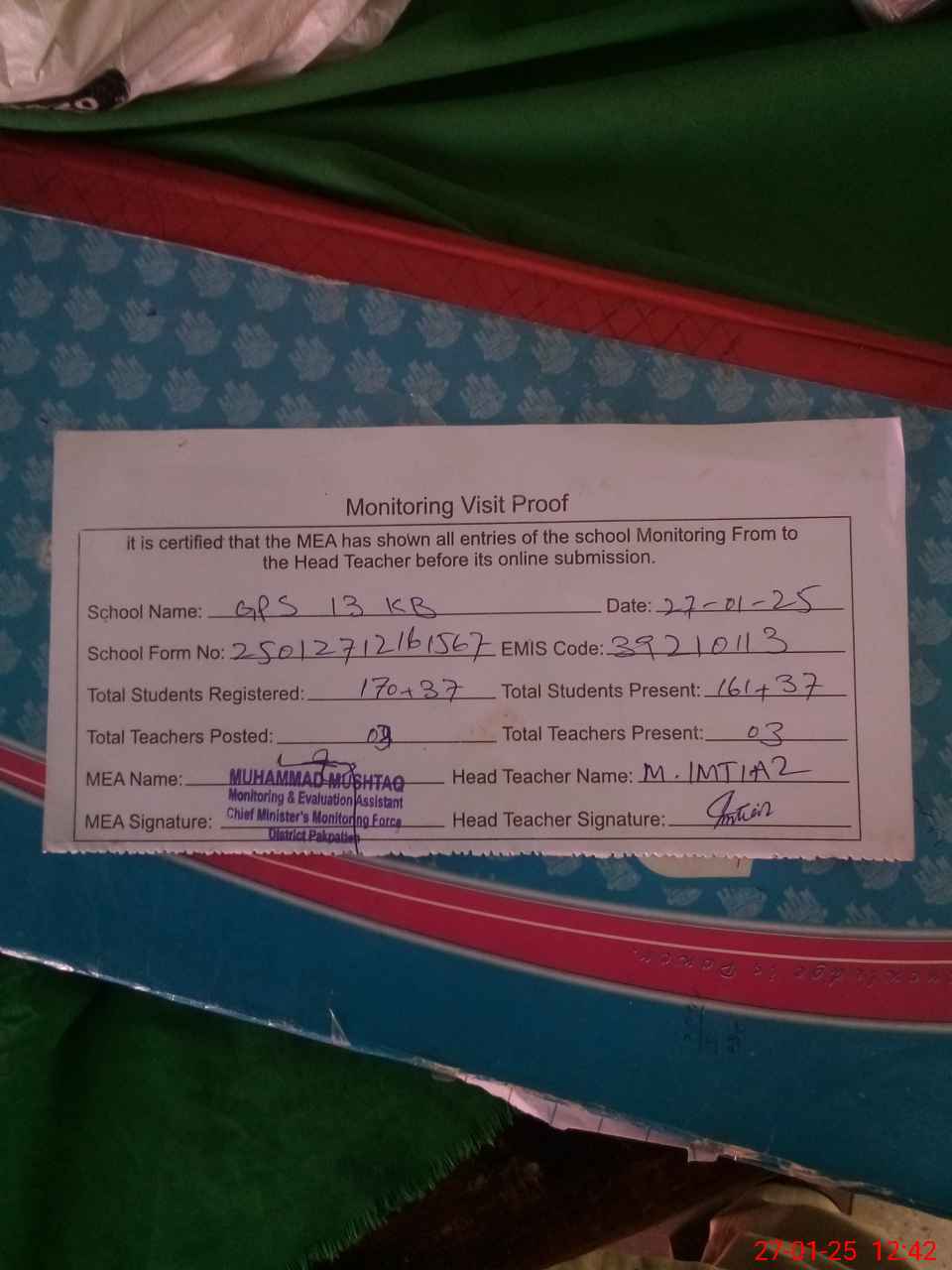 | Attendance Register | Head Teacher | MEA with School | Visit Proof |