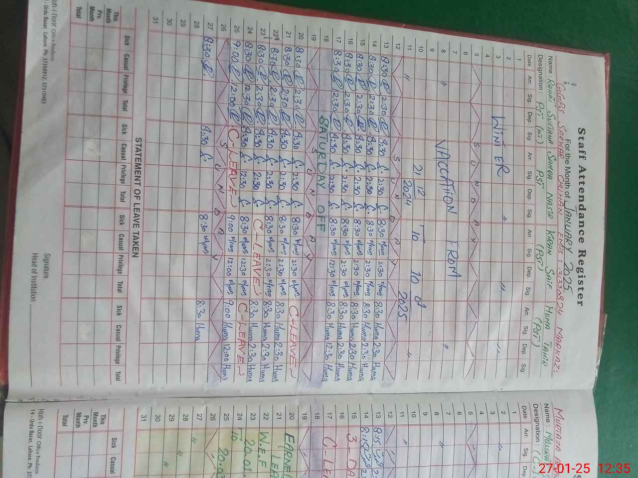 | CNIC | Full Name | Designation | R/C | Absence During Last Calender Month |