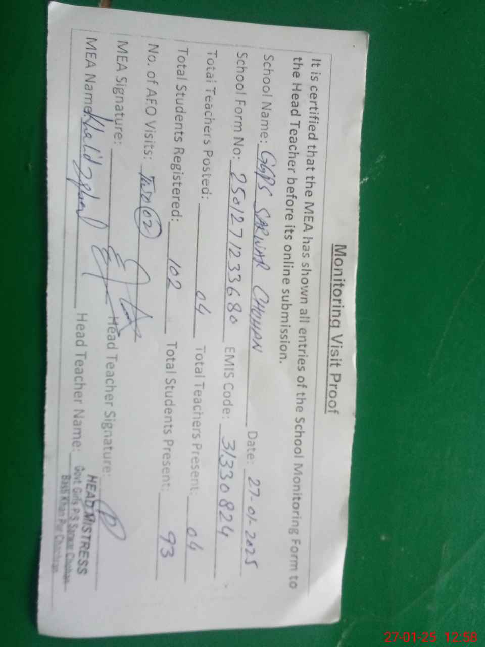 | Attendance Register | Head Teacher | MEA with School | Visit Proof |