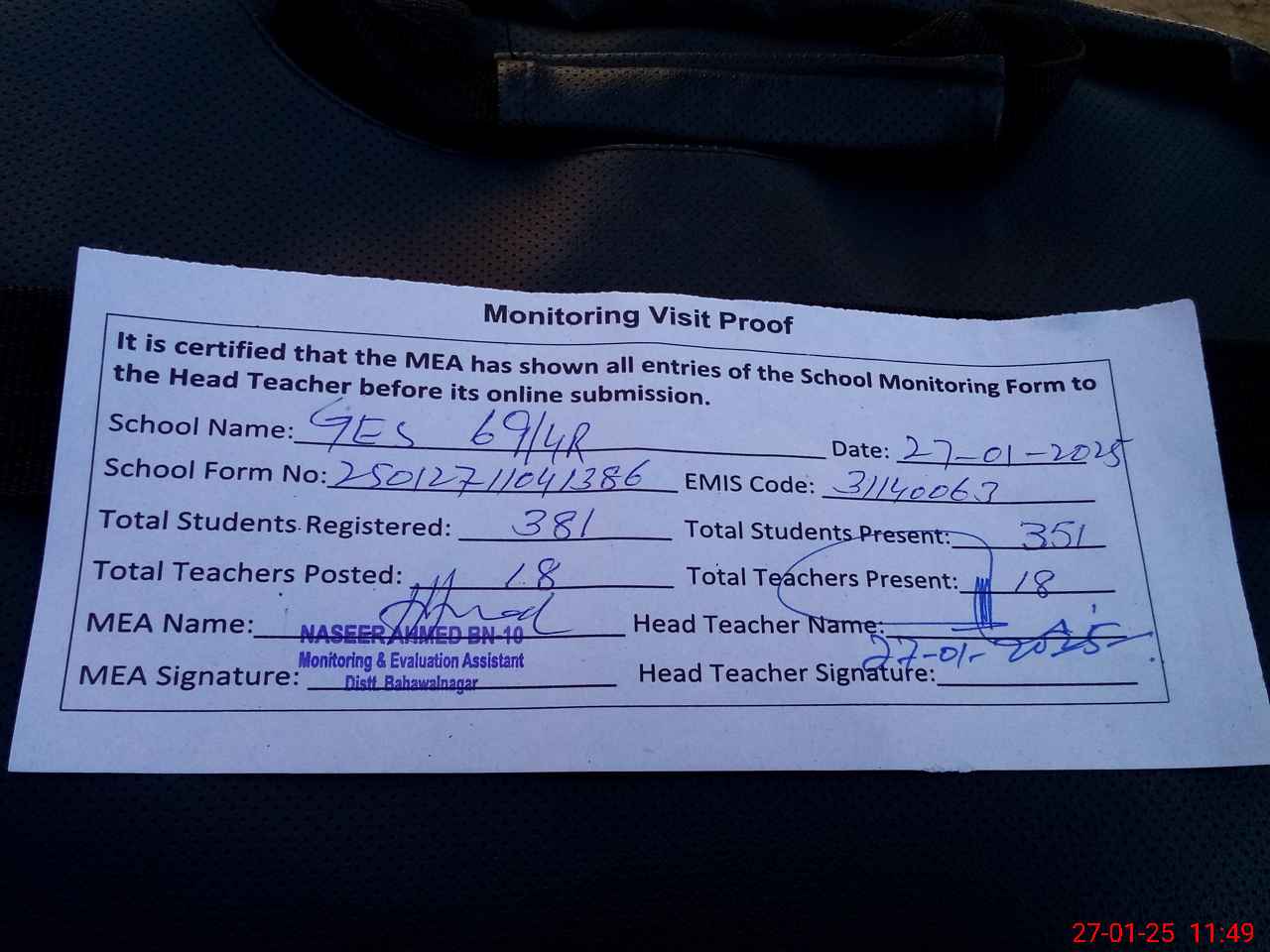 | Attendance Register | Head Teacher | MEA with School | Visit Proof |