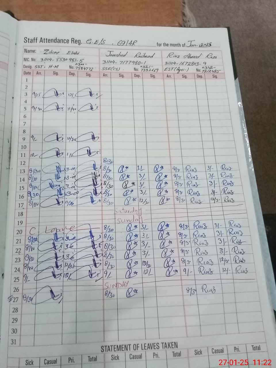 | CNIC | Full Name | Designation | R/C | Absence during last cal. month |