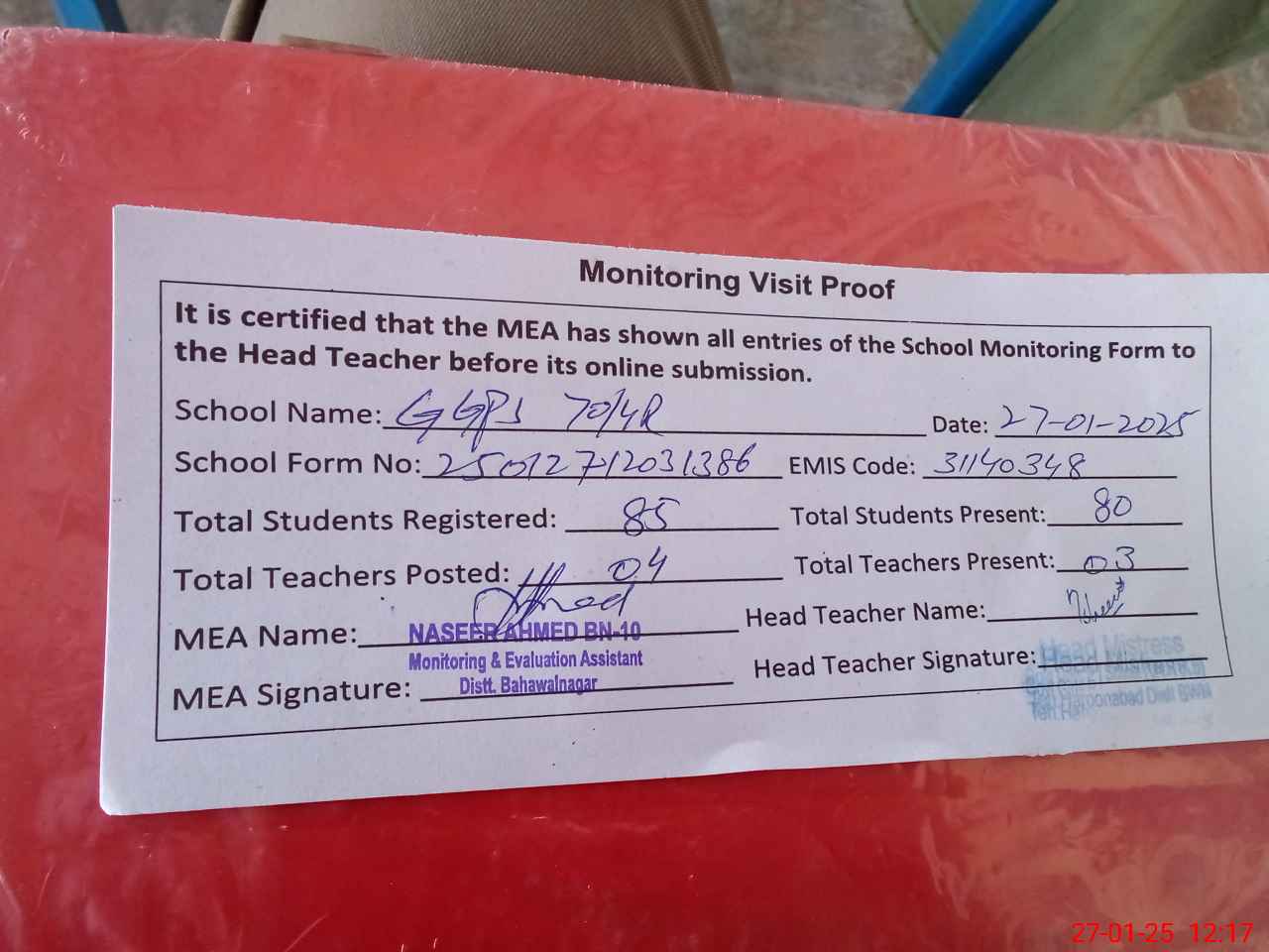 | EMIS Code: 31140348 | Name of School: GGPS CHAK NO 70/4-R | |||