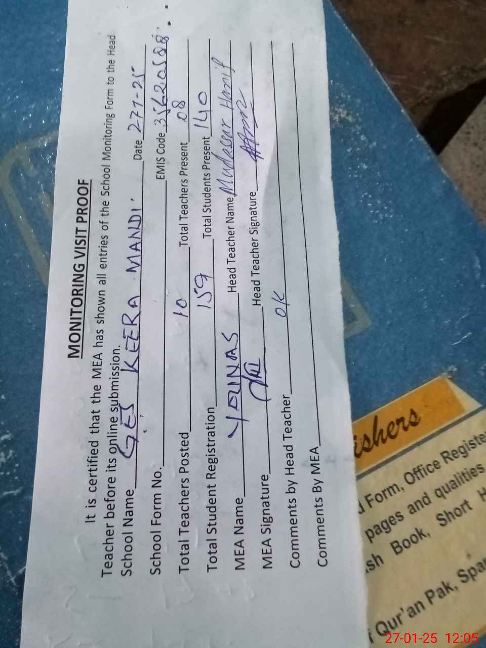 | Attendance Register | Head Teacher | MEA with School | Visit Proof |