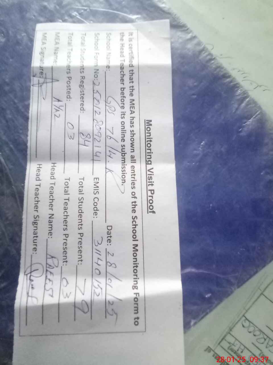 | Attendance Register | Head Teacher | MEA with School | Visit Proof |