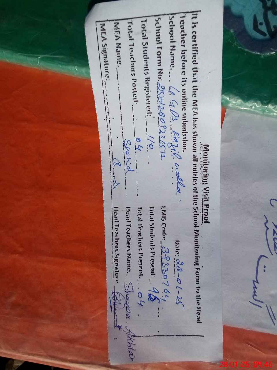 | Attendance Register | Head Teacher | MEA with School | Visit Proof |