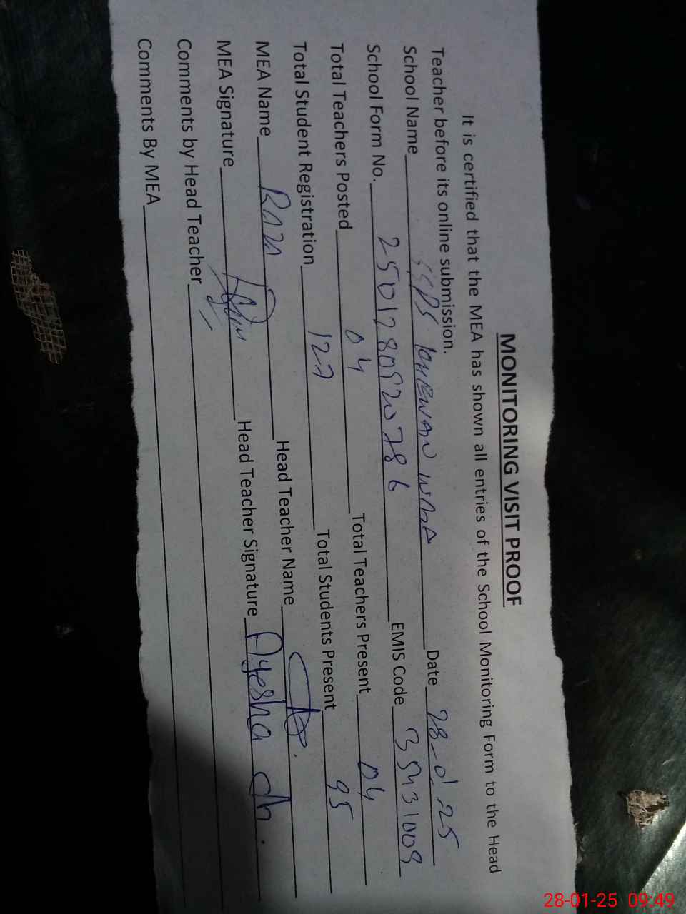| Attendance Register | Head Teacher | MEA with School | Visit Proof |