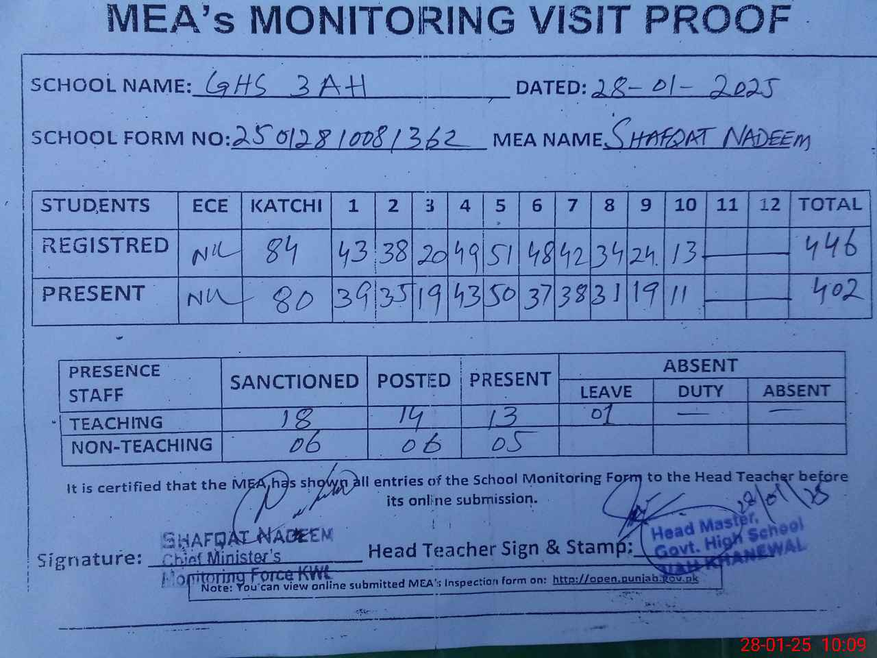 | Attendance Register | Head Teacher | MEA with School | Visit Proof |