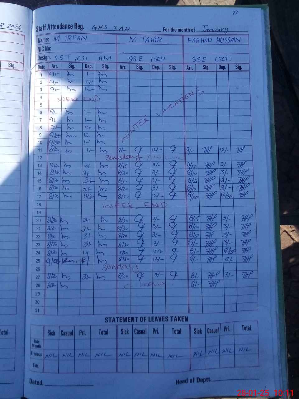 | CNIC | Full Name | Designation | R/C | Absence During Last Calender Month |
