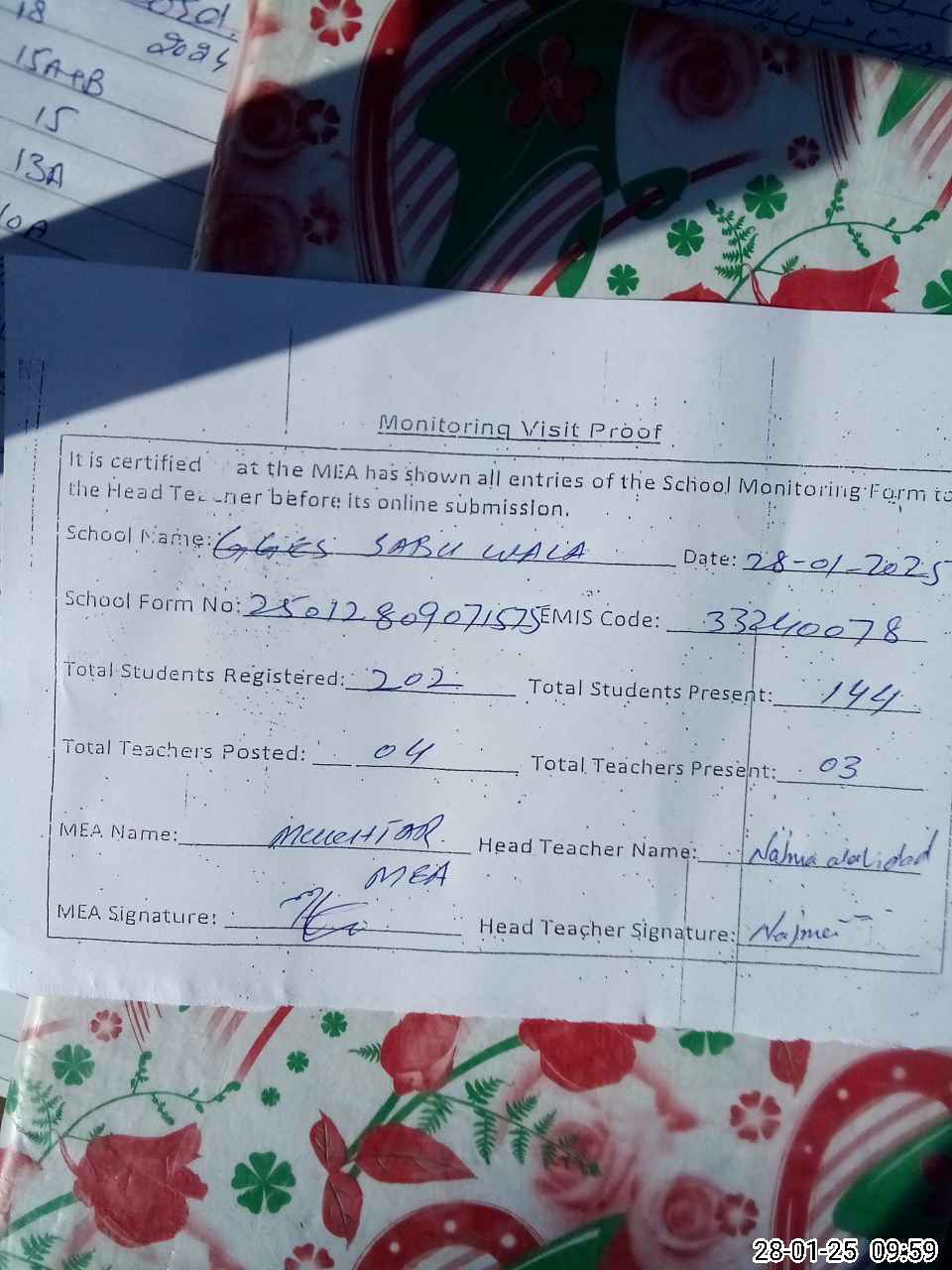 | Attendance Register | Head Teacher | MEA with School | Visit Proof |