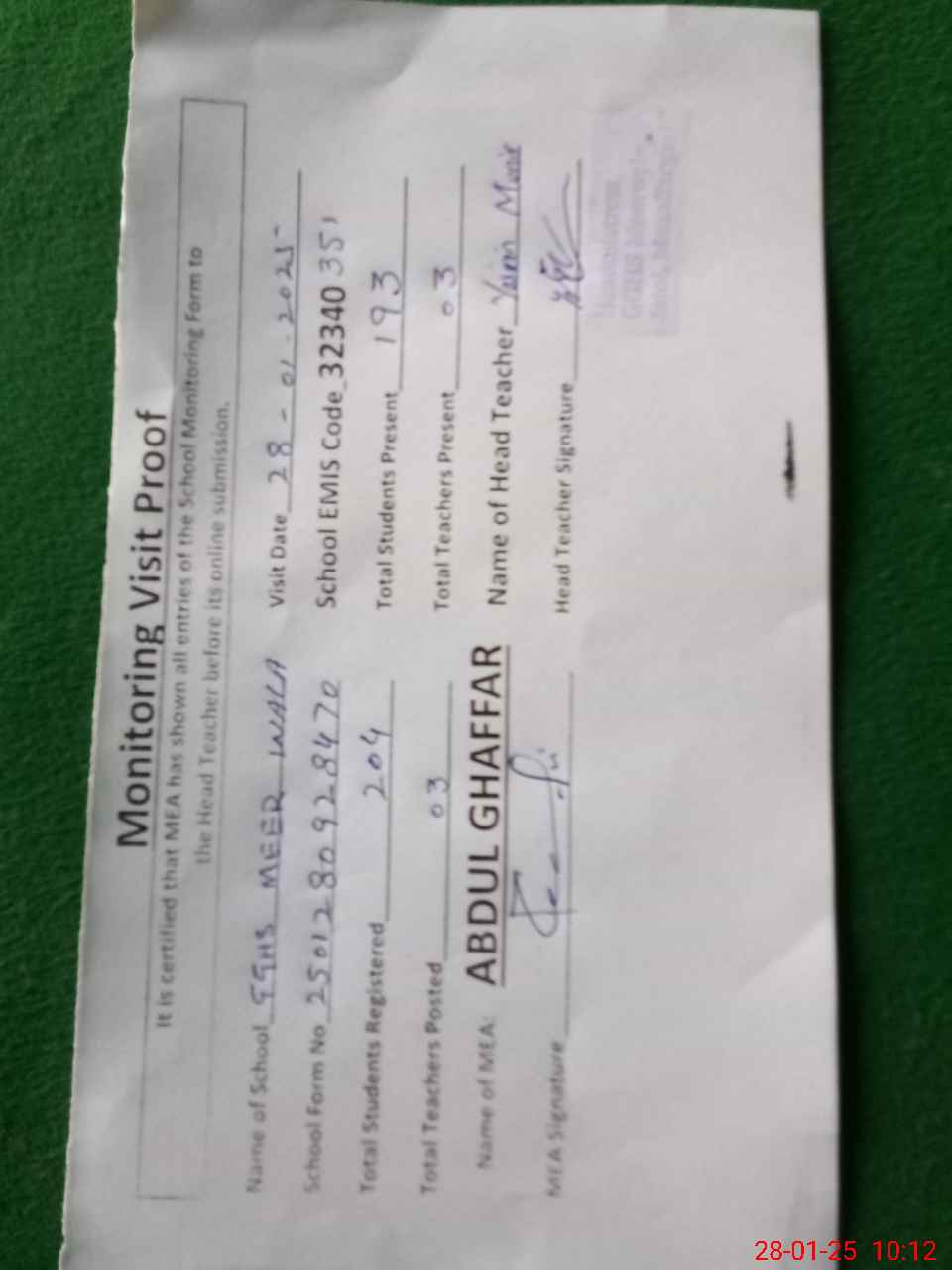 | Attendance Register | Head Teacher | MEA with School | Visit Proof |