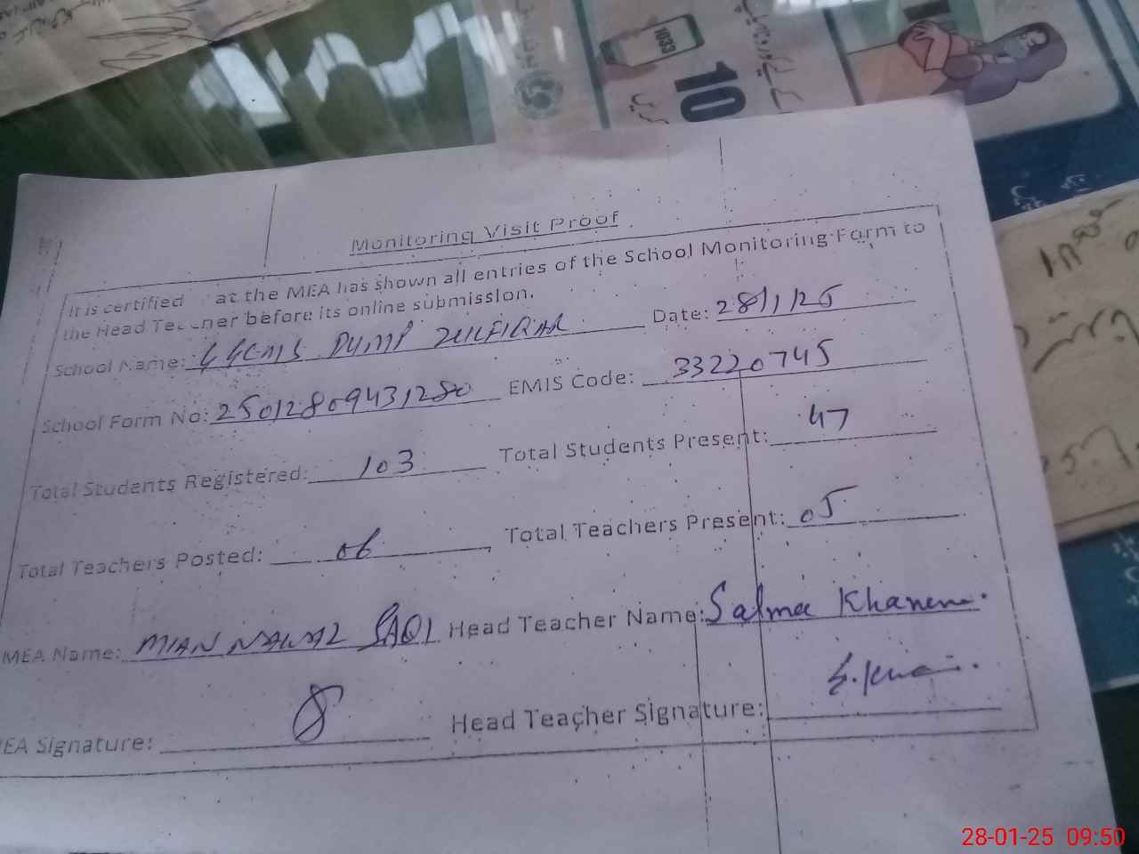 | Attendance Register | Head Teacher | MEA with School | Visit Proof |