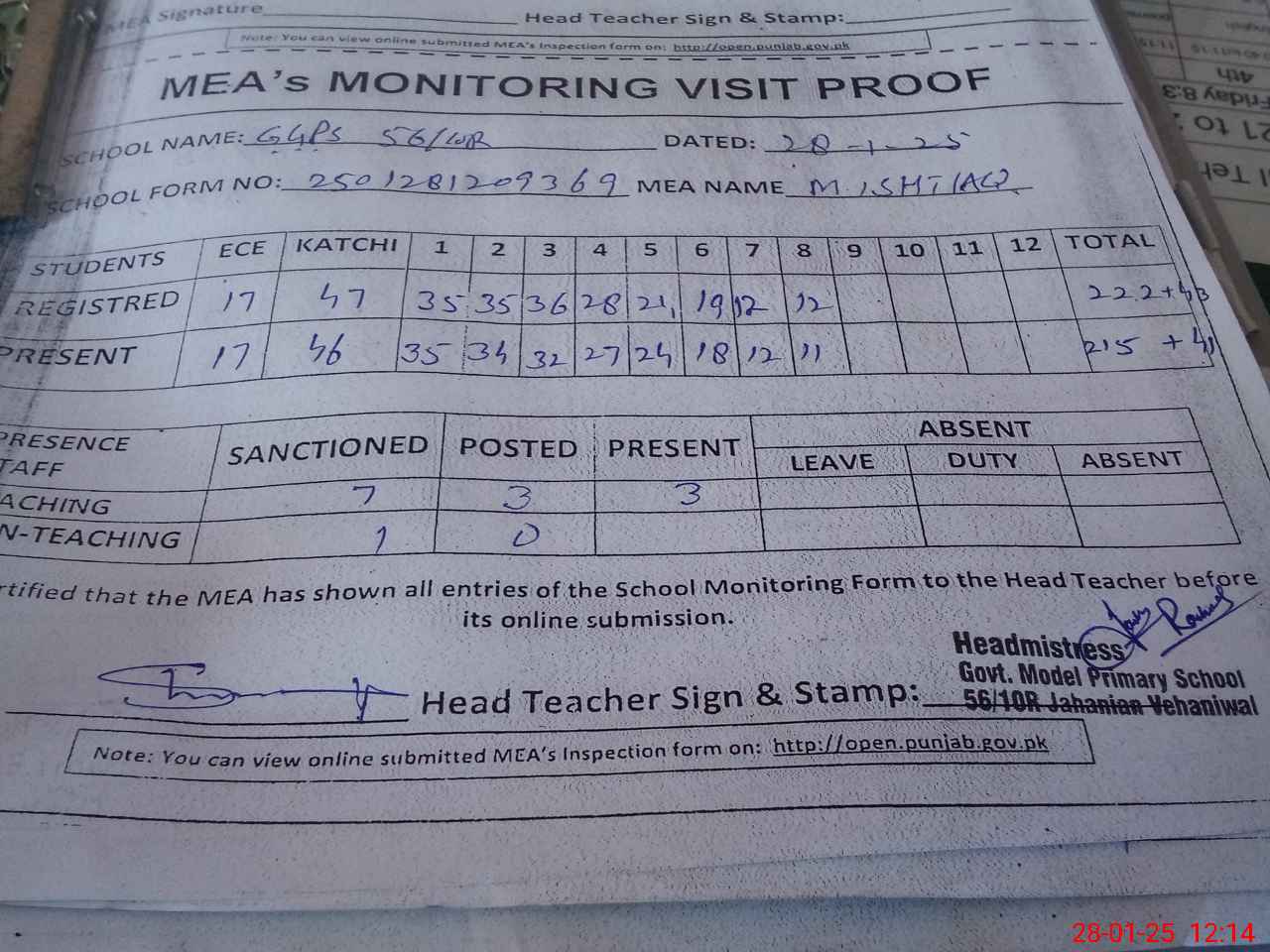 | Attendance Register | Head Teacher | MEA with School | Visit Proof |