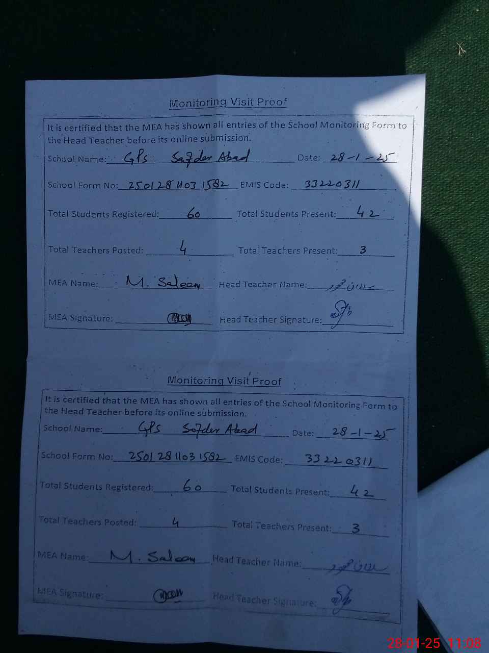| EMIS Code: 33220311 | Name of School: GPS SAFDAR ABAD | |||