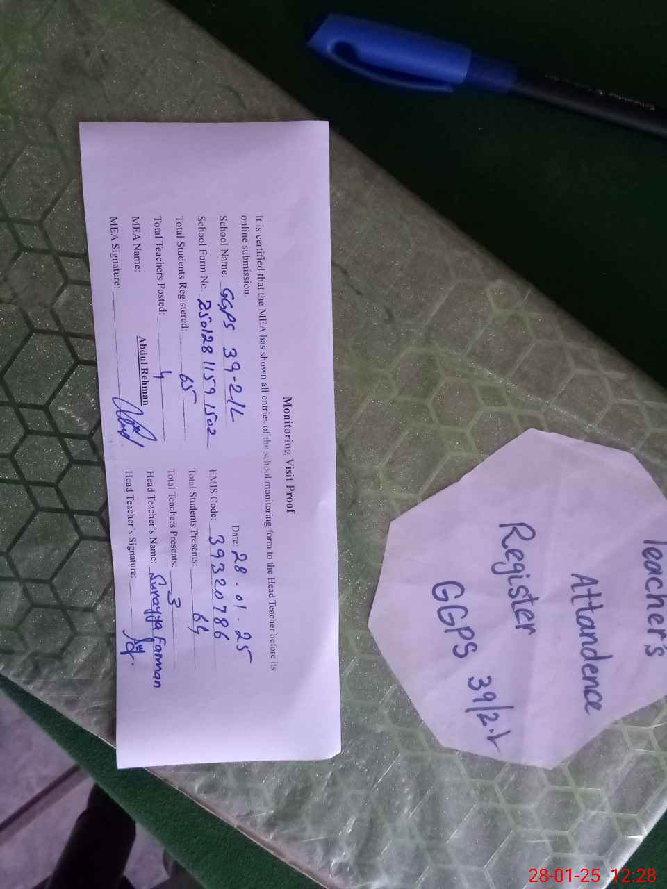 | Attendance Register | Head Teacher | MEA with School | Visit Proof |