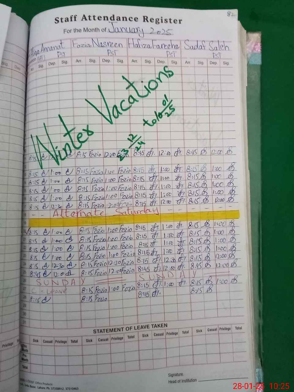 | Leave | Duty | Absent | Maternity | Medical | Ex- Pak |