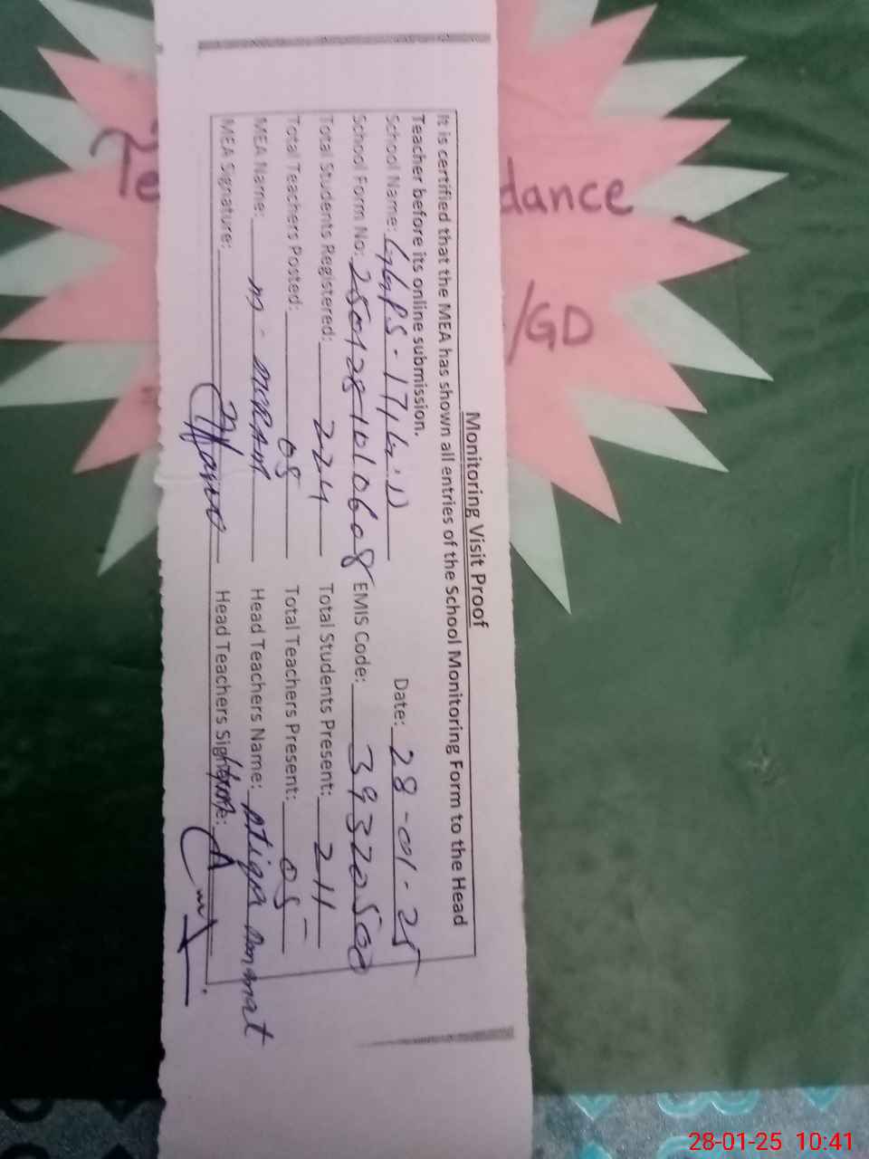 | Attendance Register | Head Teacher | MEA with School | Visit Proof |